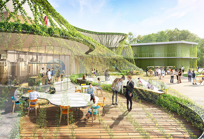 キャンパスと自然の間に建つ農学部棟(仮称)は、有機的なヒダ形状が幾重にも重なり合うことで、人々の活動と豊かな自然とを緩やかにつなぎ、広島修道大学ならではの風景を創出します。多様な特徴を備えた豊かな「ニワ」と、有機的な庇の下に広がる半屋外空間は、建物内で行われる研究や活動を発信するもう一つの拠点となります。